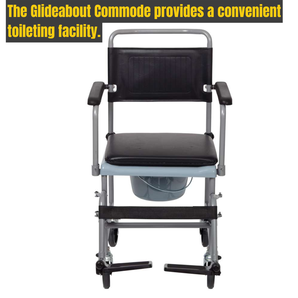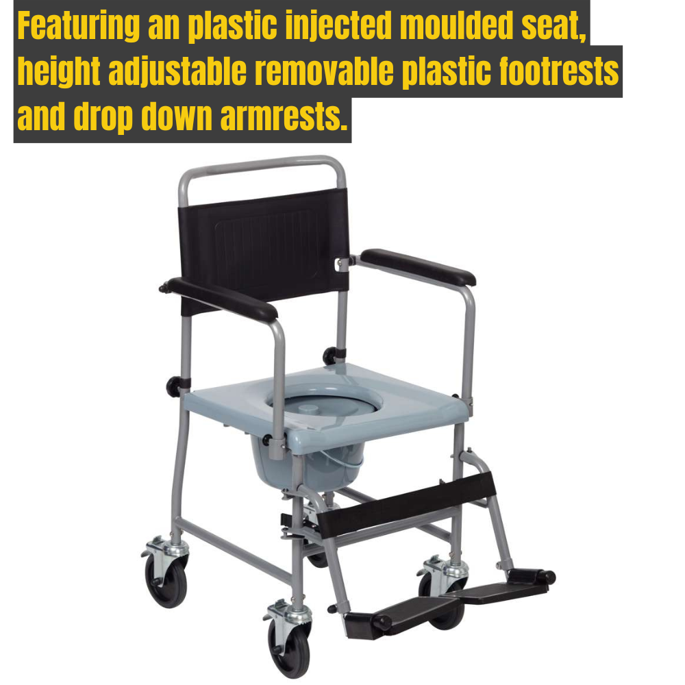 The Glideabout Commode provides a convenient toileting facility. It features four castors with brakes and a silver finish on the frame. Featuring an plastic injected moulded seat, height adjustable removable plastic footrests and drop down armrests.