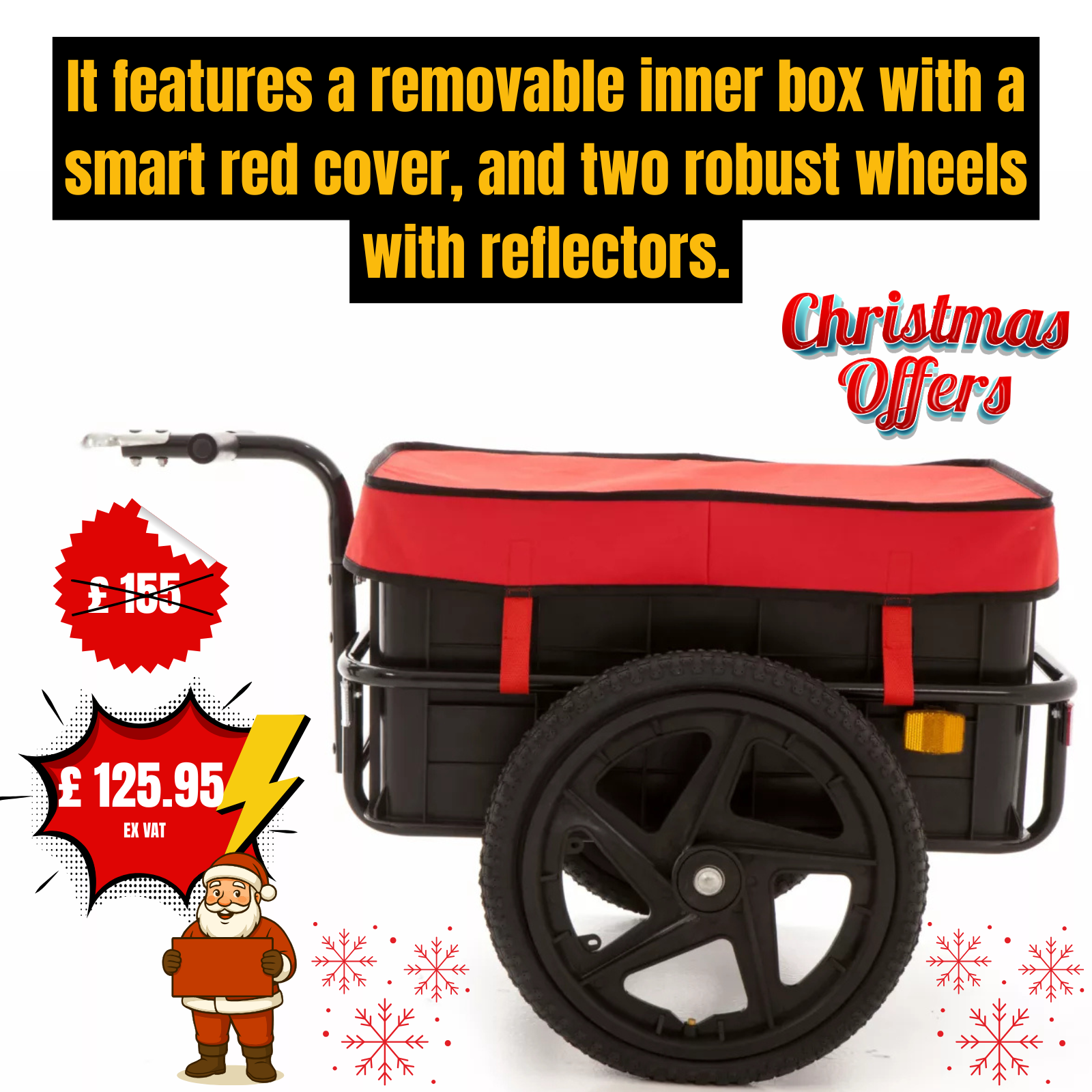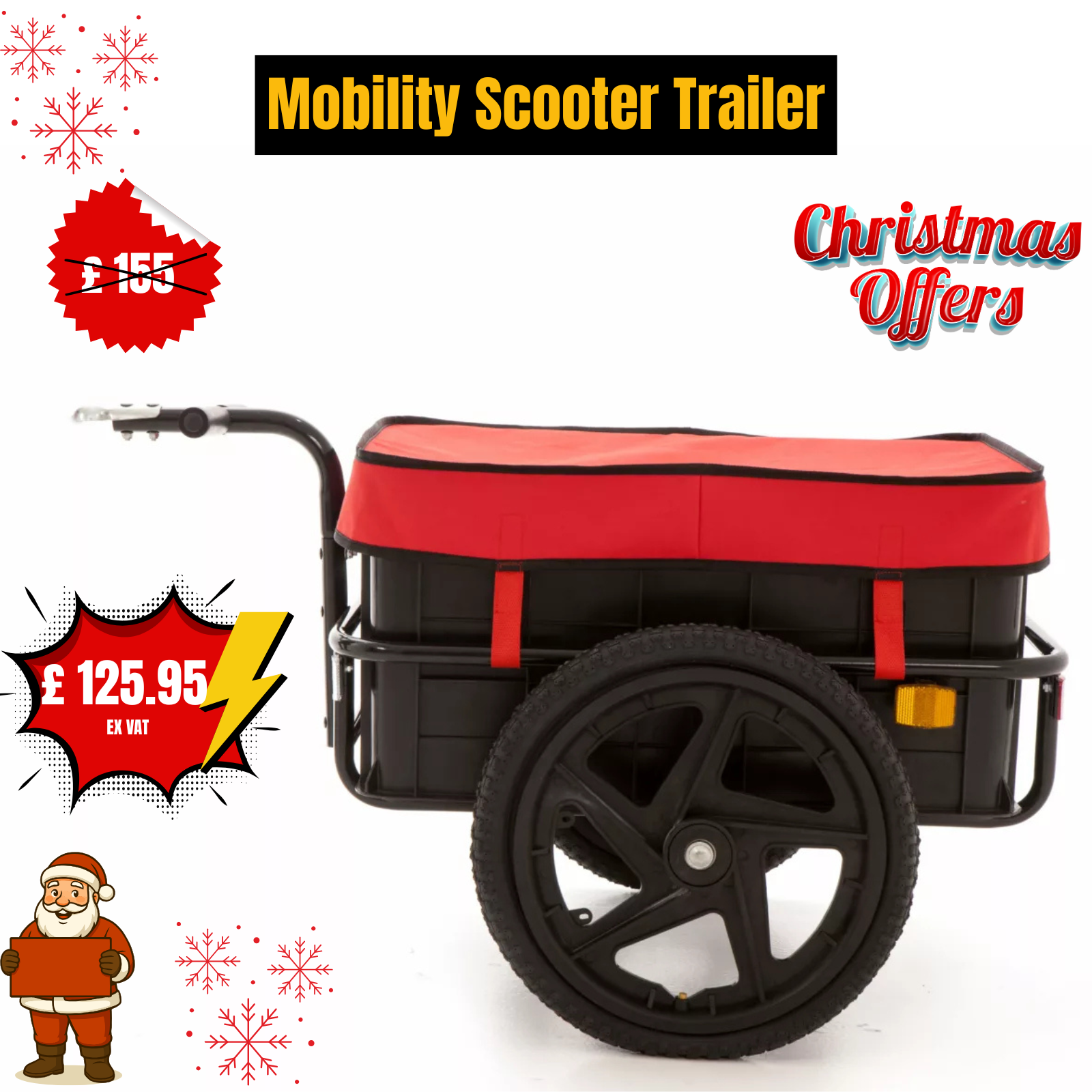 This handy scooter trailer attaches to the rear of your mobility scooter. It’s perfect for carrying shopping, personal items, or even a jacket in case of unexpected weather. It features a removable inner box with a smart red cover, and two robust wheels with reflectors.