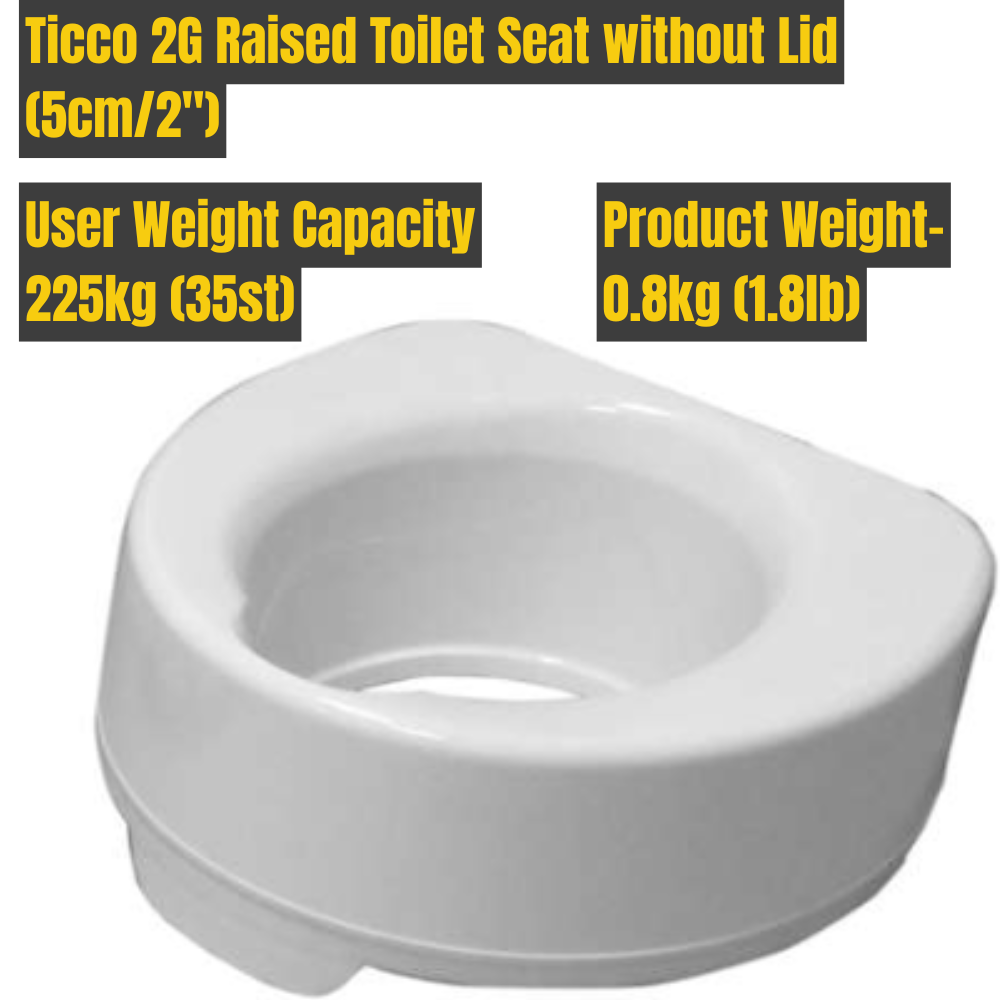 | 523600150 | Ticco 2G Raised Toilet Seat without Lid (5cm/2″) | 5cm (2″) | 39cm (15.3″) | 39cm | 0.8kg (1.8lb) | 225kg (35st) | – |