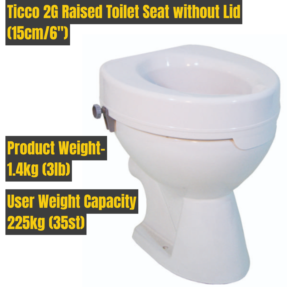 | 523600350 | Ticco 2G Raised Toilet Seat without Lid (15cm/6″) | 15cm (6″) | 39cm (15.3″) | 39cm | 1.4kg (3lb) | 225kg (35st) | – |