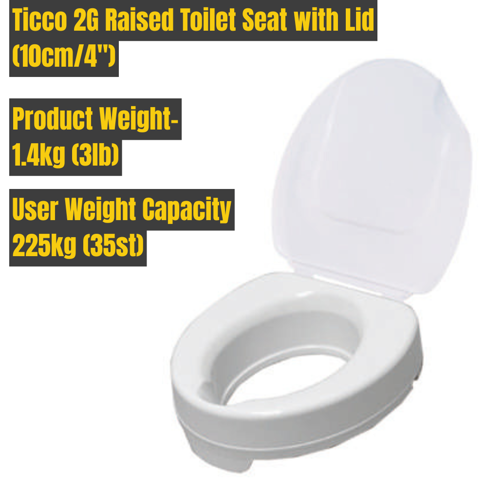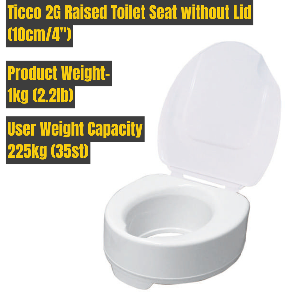 | 523400000 | Ticco 2G Raised Toilet Seat with Lid (10cm/4″) | 10cm (4″) | 39cm (15.3″) | 39cm | 1.4kg (3lb) | 225kg (35st) | 5055181306637 |