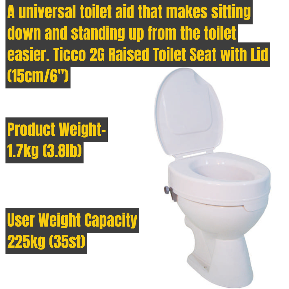 | 523600450 | Ticco 2G Raised Toilet Seat with Lid (15cm/6″) | 15cm (6″) | 39cm (15.3″) | 39cm | 1.7kg (3.8lb) | 225kg (35st) | – |