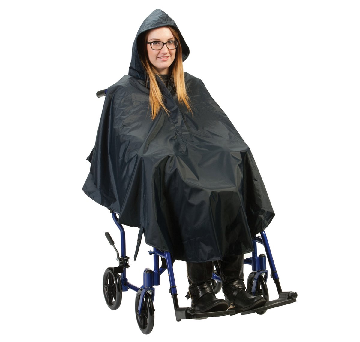 The poncho features slots to accommodate the wheelchair pushing handles this alows the users hands to be kept warm and away from the cold when being pushed.